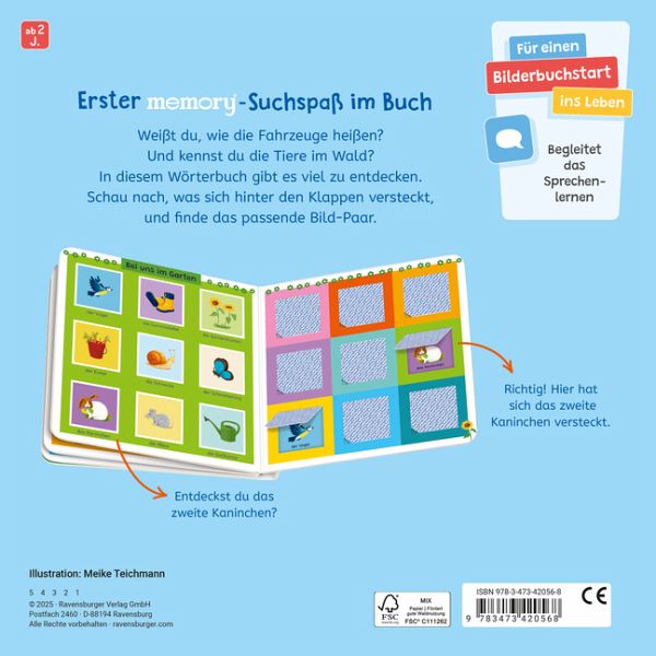 Bei diesem memory® geht garantiert kein Kärtchen verloren! Denn nun gibt es den original Ravensburger memory® Suchspaß auch im Buch. Kinder ab 2 Jahren können in diesem Mitmachbuch viele interessante Motive entdecken und Bildpaare suchen. Ob auf dem Bauernhof, im Wald oder im Kinderzimmer: Überall gibt es spannende Tiere, Fahrzeuge oder Dinge zu entdecken und neue Wörter zu lernen.