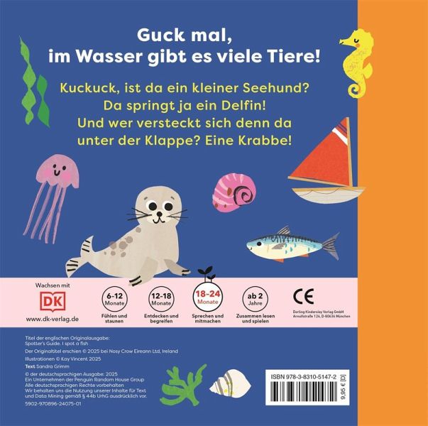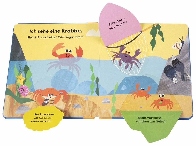 Die Krabbe hat aber viele Beine! Ob Delfin, Krake oder Seestern: Kinder sind begeistert von allen Tieren, denen sie begegnen. In diesem fröhlichen Buch mit Klappen lernen Kleinkinder ab 18 Monaten die Tiere des Meeres und der Küsten kennen. Drei stabile Klappen auf jeder Seite sorgen für großen Beschäftigungsspaß und schulen ganz nebenbei die Feinmotorik. Ein lebendiger Text mit lustigen Fragen und Ausrufen vermittelt altersgerechtes Tierwissen. Mit seinen modernen Illustrationen in leuchtenden Farben ist das interaktive Buch über Meerestiere ein tolles Geschenk zum 1. Geburtstag, das jedes Kleinkind begeistern wird.