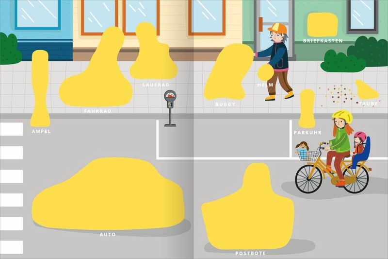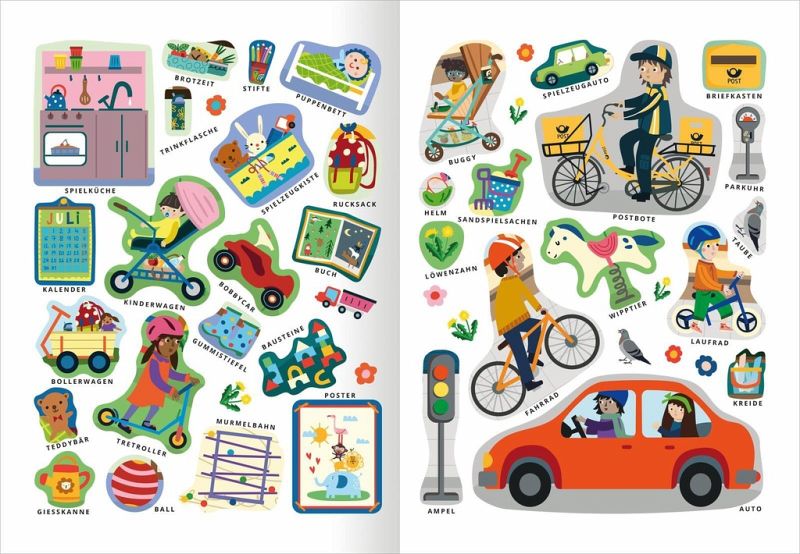 Entdecke deine Welt und die einzelnen Gegenstände, Tiere und Personen darin! Ob auf dem Spielplatz, im Kindergarten, oder auf der Straße: Spannende Szenen mit vorgegebenen Stickerflächen warten darauf, mit allerlei Aufklebern zum Leben erweckt zu werden. Sowohl die Sticker als auch die Klebeflächen sind beschriftet, sodass das Lernen und Entdecken neuer Wörter zum Kinderspiel wird. Über 150 Sticker garantieren einen Riesenklebespaß für kleine Hände ab 3 Jahren.