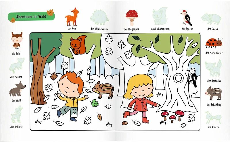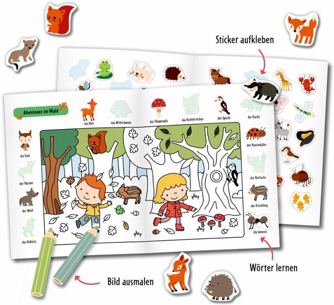 Sticker-Malbuch und Bilderwörterbuch in einem