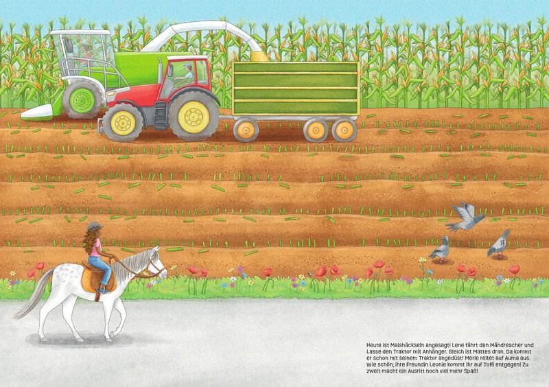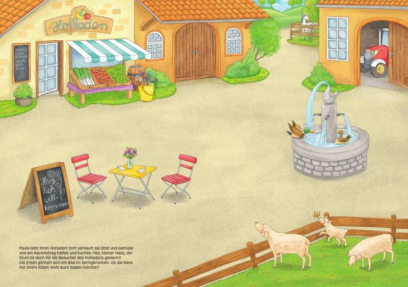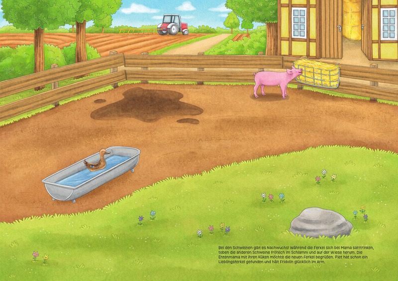 - Auf 13 verschiedene Hintergründe vom Kuhstall über das Maisfeld und den Bauerngarten, bis hin zum Hofladen können die über 300 Sticker eingeklebt werden.