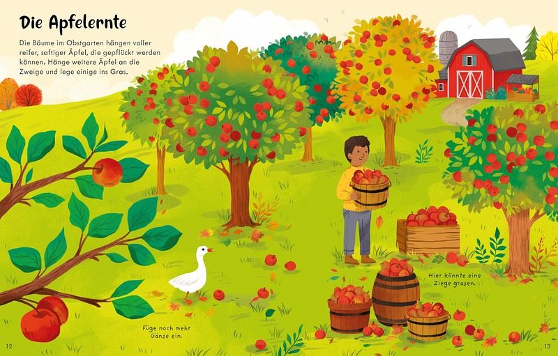 Mache einen Spaziergang durch den Wald, entdecke und benenne die bunten Herbstblätter und setze Füchse, Kaninchen und Dachse in ihre Baue - gestalte die herbstlichen Szenen mit über 180 Stickern.