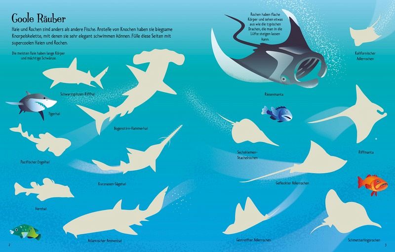 Tauche ein in die Welt der Haie und Rochen! Finde heraus, wie sie schwimmen, jagen und sich tarnen. Mit über 150 Stickern kannst du das Meer vom Korallenriff bis zur Tiefsee zum Leben erwecken.