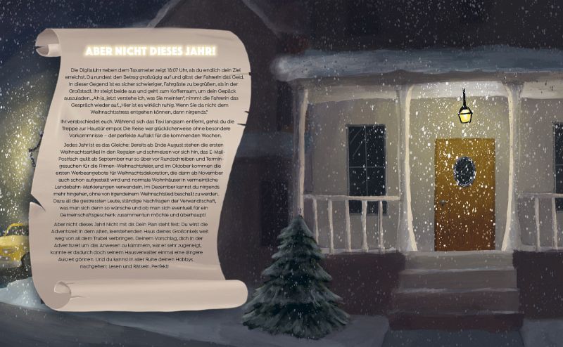 Jedes Jahr ist es das gleiche: Schon ab August stehen die ersten Weihnachtsartikel in den Regalen und schmelzen vor sich hin, Last Christmas schmettert aus dem Radio und der Weihnachtswahnsinn beginnt von Neuem. Aber nicht dieses Jahr! Nicht mit dir. Dein Plan steht fest: Du wirst die Adventszeit in dem alten Haus deines Großonkels weit weg von all dem Trubel verbringen. Doch was als ruhige Auszeit beginnt, entwickelt sich schnell zu einem wahren Abenteuer, als du einen seltsam aussehenden Apparat findest. Wo kommt der denn plötzlich her? Und viel wichtiger: wozu ist der gut? Deine Entdeckung bringt dich auf eine ungeahnte Abenteuerreise in die unterschiedlichsten Epochen der Vergangenheit und möglicherweise sogar die Zukunft ...