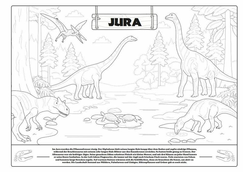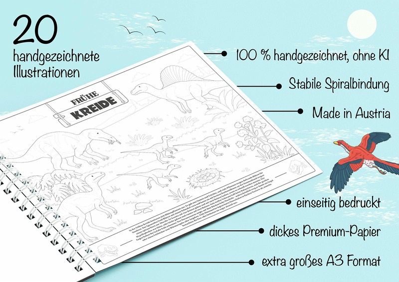 - 20 gigantische A3-Illustrationen: Extra viel Platz für grenzenlose Kreativität und große Dino-Abenteuer.
