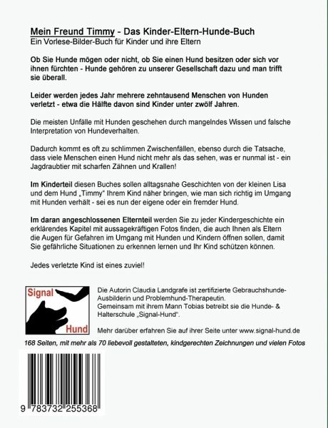 Mein Freund Timmy - Das Kinder-Eltern-Hunde-BuchEin Vorlese-Bilder-Buch zur Prävention von Beißunfällen zwischen Hunden und KindernHunde gehören zu unserer Gesellschaft dazu, man kann ihnen kaum aus dem Weg gehen. Leider werden jedes Jahr mehrere zehntausend Menschen von Hunden verletzt - etwa die Hälfte davon sind Kinder unter zwölf Jahren.Oft führen falsche Interpretation von Hundeverhalten und mangelndes Wissen über die Kommunikation von Hunden zu diesen Unfällen. Umso wichtiger ist es für Erwachsene, gefährliche Situationen zwischen Kindern und Hunden zu erkennen und sie abzuwenden, bevor jemand verletzt wird. Im reich illustrierten Kinderteil dieses Buches bringen alltagsnahe Geschichten von der kleinen Lisa und ihrem Hund Timmy Kindern näher, wie man sich richtig im Umgang mit Hunden verhält, egal ob es der eigene oder ein fremder Hund ist.Im daran angeschlossenen Elternteil gibt es zu jeder Kindergeschichte ein erklärendes Kapitel für die Eltern, das anhand von aussagekräftigen Fotos und Texten das Auge für mögliche Gefahrensituationen schulen soll.Egal, ob Sie einen Hund haben oder Hunde nicht mögen, dieses Buch hilft Ihnen, Ihr Kind zu schützen und ein wenig sicherer mit dem Thema "Hund und Kind" umgehen zu können.Jedes verletzte Kind ist eines zuviel!