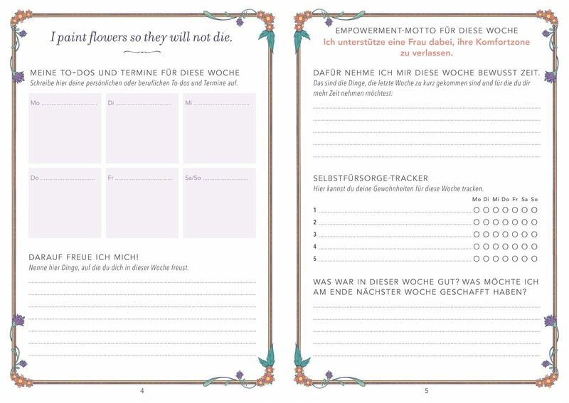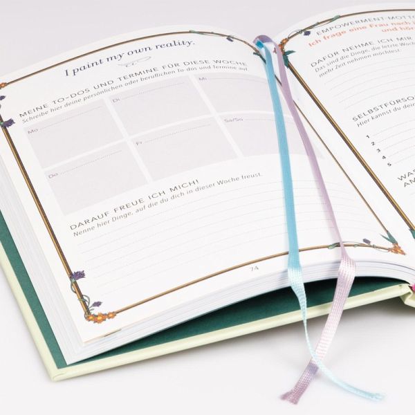 Wochenüberblick mit inspirierenden Zitaten: Jede Woche startet mit einem Zitat von Frida Kahlo oder einer anderen starken Frau, das Kraft und Zuversicht für die Woche schenken kann. Außerdem bietet diese Seite Platz für die wichtigsten To-dos und Termine für die Woche festhalten.Jede Woche gibt es ein Empowerment-Motto, mit dem Frauen sich gegenseitig stärken und ermutigen können.Raum für Dankbarkeit und schöne Dinge in der Woche: Jede Woche bietet sich die Gelegenheit, innezuhalten und zu reflektieren, welchen Dingen mehr Raum gegeben werden soll.Ein Selbstfürsorge-Tracker unterstützt, gute Gewohnheiten im Blick zu behalten.Reflexionsfragen als Wochenabschluss helfen, wichtige Momente bewusst wahrzunehmen.Freie Tagebuchseiten für ausführlichere Gedanken.Frida Kahlo Artwork: Bunte, kunstvolle Motive von und mit Frida Kahlo machen dieses Tagebuch zu einem ganz besonderen Begleiter im Alltag.Dieses Tagebuch wurde von Menschen geschrieben und nicht von einer generativen KI.