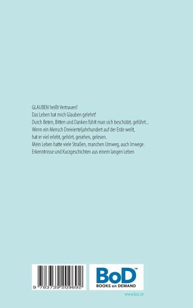 GLAUBEN heißt Vertrauen!Das Leben hat mich Glauben gelehrt!Durch Beten, Bitten und Danken fühlt man sich beschützt, geführt...Ohne Beten und Glauben wird man verführtWenn ein Mensch Dreivierteljahrhundert auf der Erde weilt, hat er viel erlebt, gehört, gesehen, gelesen. Mein Leben hatte viele Straßen, manchen Umweg, auch Irrwege. Erkenntnisse und Kurzgeschichten aus einem langen Leben