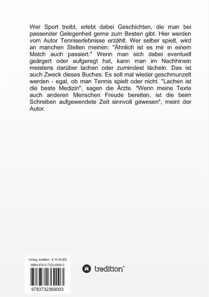 Wer Sport treibt, erlebt dabei Geschichten, die man bei passender Gelegenheit gerne zum Besten gibt. Hier werden vom Autor Tenniserlebnisse erzählt. Wer selber spielt, wird an manchen Stellen meinen: "Ähnlich ist es mir in einem Match auch passiert." Aufstiege, Abstiege, Diskussionen über Linienbälle, Regenspiele, Hitzeschlachten, Verletzungen, Forderungsspiele, Beckerhecht, Vereinsprobleme, geänderte Tennisregeln, Trainerwechsel, dass alles sind Themen in einem "Tennisleben".