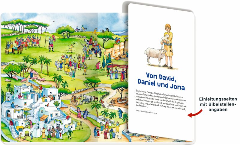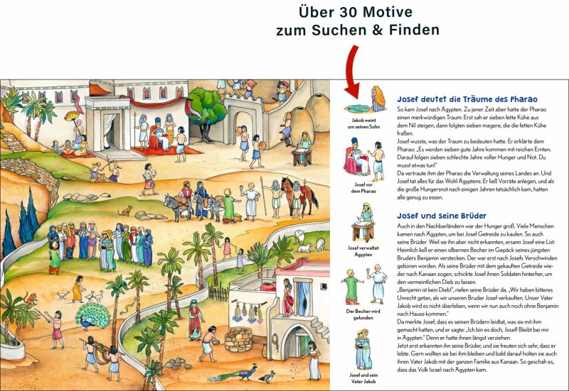 Mit 6 großformatigen WimmelbildernÜber 30 Vignetten zum Suchen und Finden22 kurz und kindgerecht nacherzählte BibelgeschichtenMit 6 großen Ausfaltseiten
