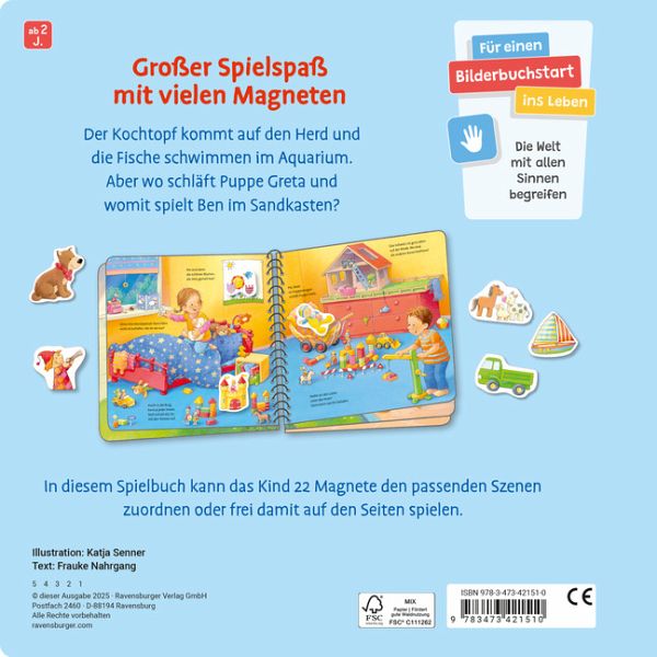 Weißt du, was wohin gehört? Die Äpfel kommen in den Obstkorb und die Vogelmama fliegt zu ihrem Nest. Aber wo schläft Puppe Greta und womit spielt Ben im Sandkasten? In diesem abwechslungsreichen Spielbilderbuch kann das Kind 22 Magnete den passenden Szenen zuordnen oder frei mit ihnen auf den magnetischen Buchseiten spielen. Das macht Spaß und fördert ganz nebenbei Feinmotorik, Kreativität und Konzentration.