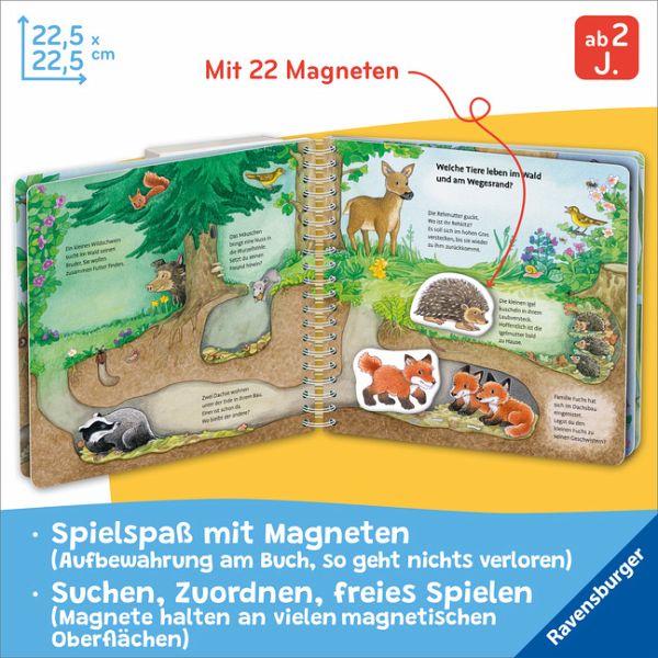 In diesem Spielbuch finden alle Tiere ein Zuhause. Die Igel haben es sich im Laub gemütlich gemacht, der Fuchs lebt mit seinen Kindern in einem Bau und die Vogelkinder warten im Nest auf Futter. Aus 22 naturnah gestalteten Magneten kann jedes Kind das Tier auswählen, das zur gezeigten Umgebung passt. Auch Tiere und ihre Kinder können hier zusammengebracht werden. Dank der vollflächig magnetischen Buchseiten können die Tiere außerdem ganz frei platziert werden. Das fördert Kreativität und Feinmotorik.