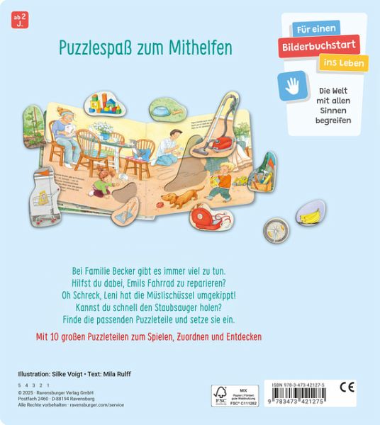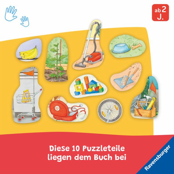 Puzzlespaß für alle, die gern mithelfen! Auf den fünf Seiten können insgesamt 10 abwechslungreiche Motive eingesetzt werden. Passgenaue Vertiefungen erleichtern das Einsetzen und kurze Texte helfen beim Zuordnen der richtigen Puzzleteile. Machst du mit und bringst den neuen Reifen auf Emils Fahrrad an? Und kannst du Leni den Handfeger bringen?