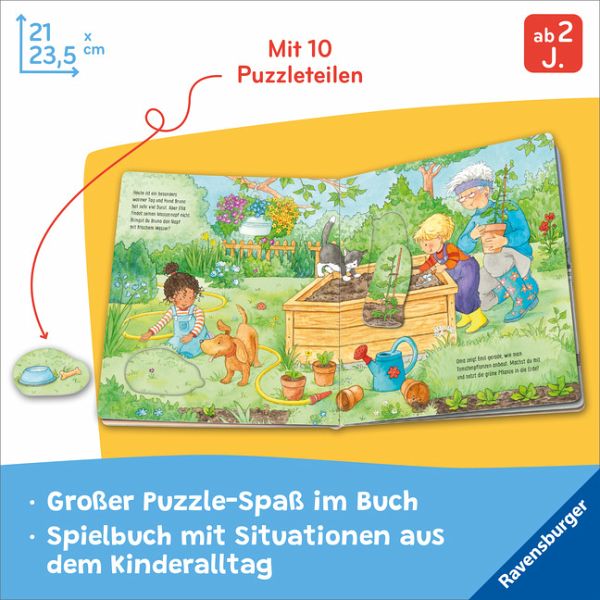 Zehn große, stabile Puzzleteile zum Einsetzen bieten langanhaltenden Spielspaß. Kurze Texte helfen beim Zuordnen der Motive und erzählen kleine Geschichten.
