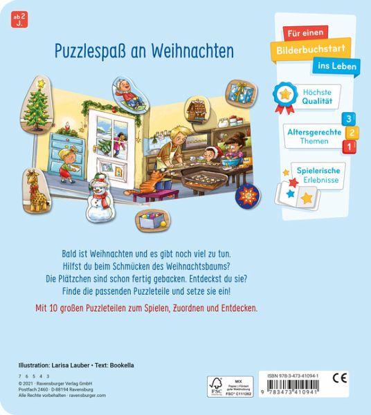 Großer Puzzlespaß für kleine Weihnachtsfans! Auf den fünf Seiten können je zwei weihnachtliche Motive als Puzzle eingesetzt werden. Passgenaue Vertiefungen erleichtern das Einsetzen und kurze Texte helfen beim Zuordnen der richtigen Puzzleteile und erzählen kleine Geschichten. Schau, welche leckeren Weihnachtskekse die Kinder mit Papa backen? Und an welches Fenster kommt der festlich leuchtende Stern? Die liebevoll gestalteten Szenen bringen den Feiertagszauber in jedes Haus und lassen die Kinder spielerisch ihre liebsten Weihnachtsmotive entdecken. Das Buch ist im Handumdrehen wieder aufgeräumt und sortiert: Nach dem Spiel können die Puzzleteile einfach im Buch verbleiben. Es fällt nichts heraus. Auch die praktische Schale auf dem Buchcover bietet Platz zum Aufbewahren der Teile.