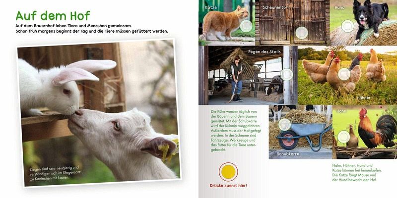 Entdecke den Bauernhof in 50 Sounds und tollen Bildern. Erfahre spannende Dinge über Tiere und Fahrzeuge. Wie klingt die Kuh? Welche Geräusche machen Hühner? Großer Hörspaß für kleine Kinder. Auf Knopfdruck sind Tiergeräusche oder Fahrzeuge zu hören. Mit hochwertigen Fotos, spannenden Sachtexten und realistischen Sounds. Ein ideales Geschenkbuch für Kleinkinder.