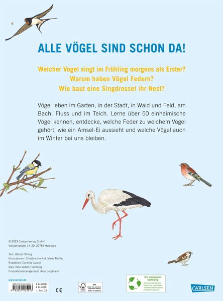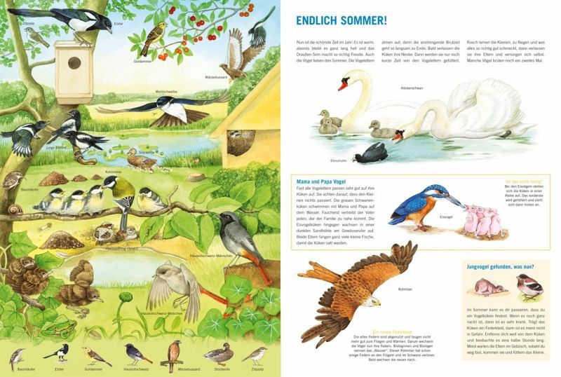Sachbilderbuch mit einfachen Vorlesetexten zu Gesang, Ernährung, Brutzeit und Vogelflug Begleitet durch den Jahreslauf und zeigt Aktivitäten von Vögeln in jeder Saison Über 50 heimische Vogelarten in detailreichen und naturgetreuen Illustrationen Großformatiges Pappbilderbuch mit stabilen Seiten