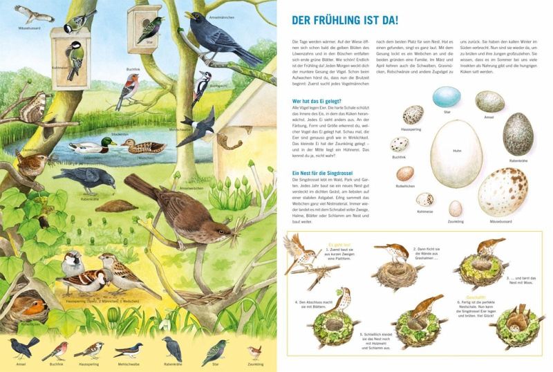 Wie sieht ein Amsel-Ei aus? Warum haben Vögel Federn? Und welche Gartenvögel können wir im Winter antreffen? Hier lernen Kindergartenkinder über 50 heimische Vogelarten kennen und begleiten sie durch die vier Jahreszeiten. Sie sind mit dabei, wenn Blaumeisen und Rotkehlchen im Frühjahr ihre Nester bauen und im Sommer ihre Jungen bei den ersten Flugrunden beobachten. Oder im Herbst, wenn Weißstörche und andere Zugvögel gen Süden ziehen, während sich der Eichelhäher zu Hause eine dicke Fettschicht anfrisst. Ergänzt durch naturgetreue und detailreiche Illustrationen gibt es auf jeder Seite viel zu entdecken. Ideal, um in die spannende Welt der Vögel einzutauchen.