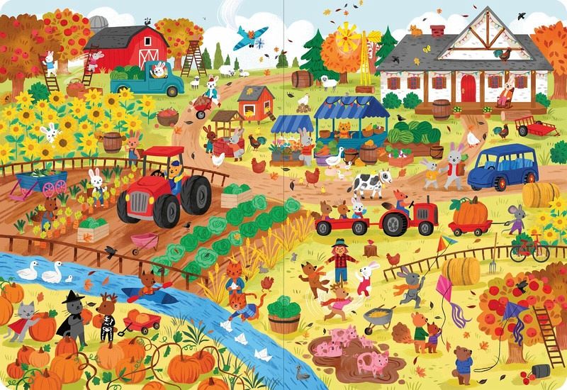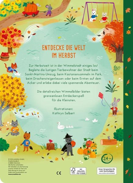 Kaum fallen die ersten Blätter von den Bäumen, verwandelt sich Wimmelstadt in eine kunterbunte Herbstlandschaft. Im Stadtpark sammeln die ersten Familien Kastanien, machen einen Herbstspaziergang oder lassen ihre Drachen steigen. Schau, dort werden lustige Gesichter in Kürbisse geschnitzt! Natürlich finden auch schon erste Vorbereitungen für den Sankt-Martins-Umzug statt. Begleite die fröhlichen Bewohner von Wimmelstadt in den Park, beim Spaziergang durch den Herbstregen und beim Laternebasteln und finde und erlebe viele lustige und spannende Abenteuer. Das große Format bietet grenzenlosen Entdeckerspaß für Kleinkinder ab 18 Monaten!
