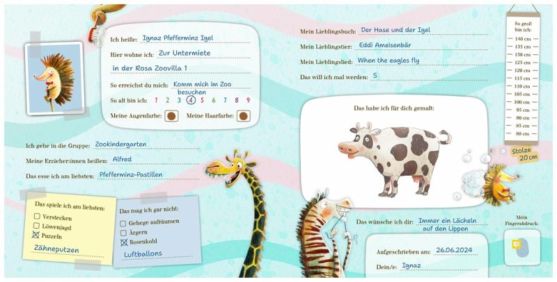 Ignaz Pfefferminz Igel und seine Freunde aus dem Zoo erobern jetzt auch die Kindergärten! Auf 64 tierisch gestalteten Seiten können sich alle Freunde verewigen und einfache Fragen beantworten, die Augen- und Haarfarbe ankreuzen und das Lieblingstier malen. Außerdem gibt es reichlich Platz für gute Wünsche und den eigenen Fingerabdruck. Die urkomischen Illustrationen von Günther Jakobs machen dieses Freundebuch zu einem echten Hingucker, der in keiner Kita fehlen darf.