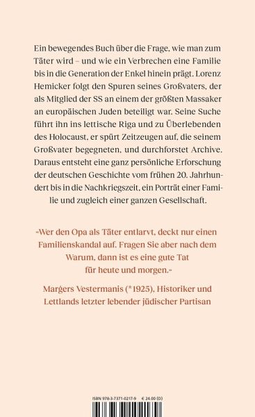 Im Spätherbst des Jahres 1941 ermorden die SS und ihre Helfer über 27000 Juden im Wald von Rumbula. Die Gruben, in denen die Menschen erschossen werden, konstruiert der SS-Offizier Ernst Hemicker. Verurteilt wird er dafür nie. Lorenz Hemicker wächst Jahrzehnte später mit einer vagen Ahnung auf, welches Verbrechens sich sein Großvater schuldig gemacht hat. Er kennt nur ein paar Sätze, die sein Vater bei jeder sich bietenden Gelegenheit im Freundes- und Bekanntenkreis wiederholt. Als beide nach Lettland reisen wollen, um mehr über die Taten von Ernst Hemicker zu erfahren, stirbt der Vater unerwartet. Für Lorenz Hemicker wird diese Zäsur der Beginn einer jahrelangen Suche nach den Spuren seines Großvaters. Sie führt ihn an den Ort des Massakers, zu Überlebenden des Holocaust in Riga und in die Tiefen deutscher Weltkriegsarchive. Dabei entsteht das Bild eines Mannes, der - wie viele andere mit ihm - vom Jedermann zum Täter wird und dessen Taten seinen Sohn und seinen Enkel noch lange über seinen Tod hinaus wie ein Schatten begleiten.