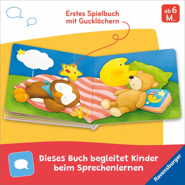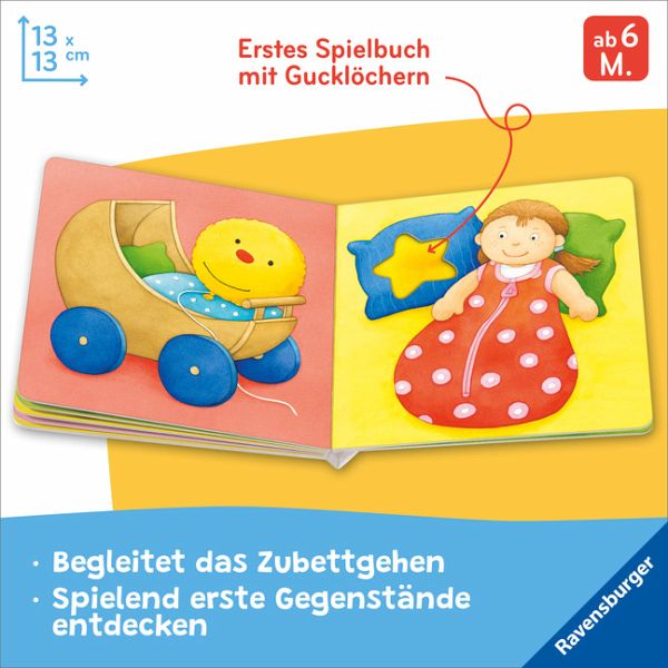 Schon die Kleinsten sind begeistert, wenn sie Gegenstände, die sie beim Schlafen gehen begleiten, im Bilderbuch wiederfinden. Da ist die Spieluhr, die ein Gute-Nacht-Lied spielt, und die Kuscheltiere, die schon in ihren Bettchen schlafen. In diesem handlichen Bilderbuch können Kleinkinder die Dinge aus ihrem Alltag spielerisch wiederentdecken oder kennenlernen. Zahlreiche Gucklöcher laden kleine Kinderhände zum Hineingreifen und Umblättern ein. Das macht Spaß und fördert die Feinmotorik.