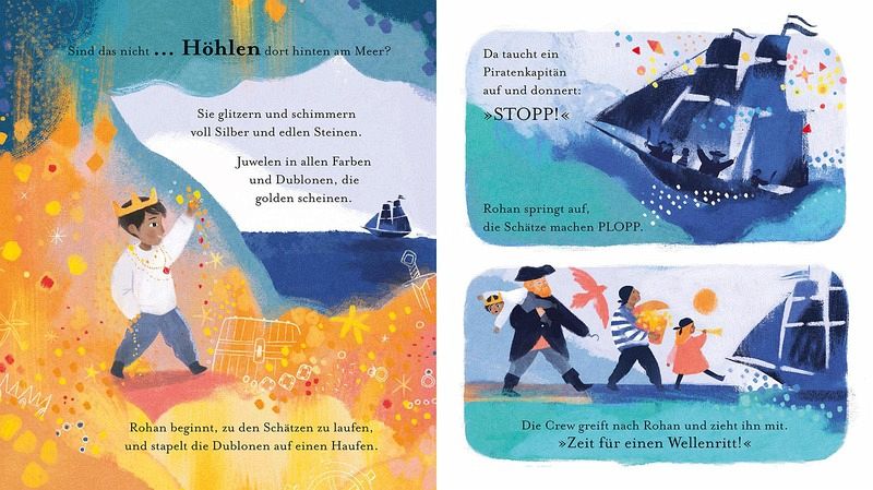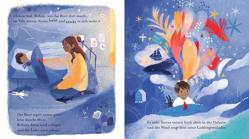 Drachen und Dinos, hopsende Hasen und Roboter... Die Aufregungen des Tages sausen Rohan abends durch den Kopf und sein Herz tanzt aufgeregt. Doch seine Mutter weiß, wie er sanft ins Land der Träume gleiten kann: mit seinem Gute-Nacht-Boot. "Schau mal, Rohan, was das Boot dort macht, im Takt deines Atems hebt und senkt es sich sacht."