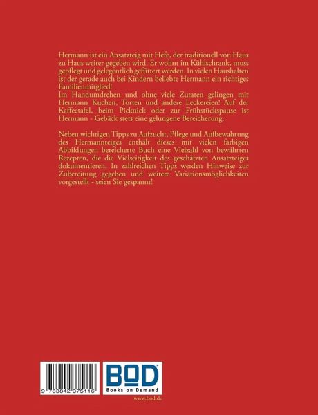 Hermann ist ein Ansatzteig mit Hefe, der traditionell von Haus zu Haus weiter gegeben wird. Er wohnt im Kühlschrank, muss gepflegt und gelegentlich gefüttert werden. In vielen Haushalten ist der gerade auch bei Kindern beliebte Hermann ein richtiges Familienmitglied! Im Handumdrehen und ohne viele Zutaten gelingen mit Hermann Kuchen, Torten und andere Leckereien! Auf der Kaffeetafel, beim Picknick oder zur Frühstückspause ist Hermann - Gebäck stets eine gelungene Bereicherung. Neben wichtigen Tipps zu Aufzucht, Pflege und Aufbewahrung des Hermannteiges enthält dieses mit farbigen Abbildungen bereicherte Buch eine Vielzahl von bewährten Rezepten, die die Vielseitigkeit des geschätzten Anssatzteiges dokumentieren. In zahlreichen Tipps werden Hinweise zur Zubereitung gegeben und weitere Variationsmöglichkeiten vorgestellt.