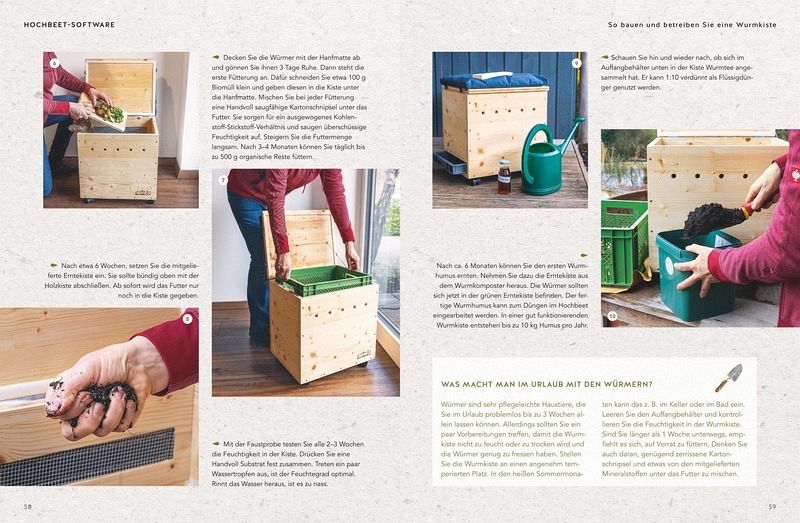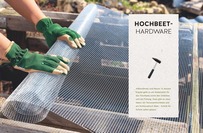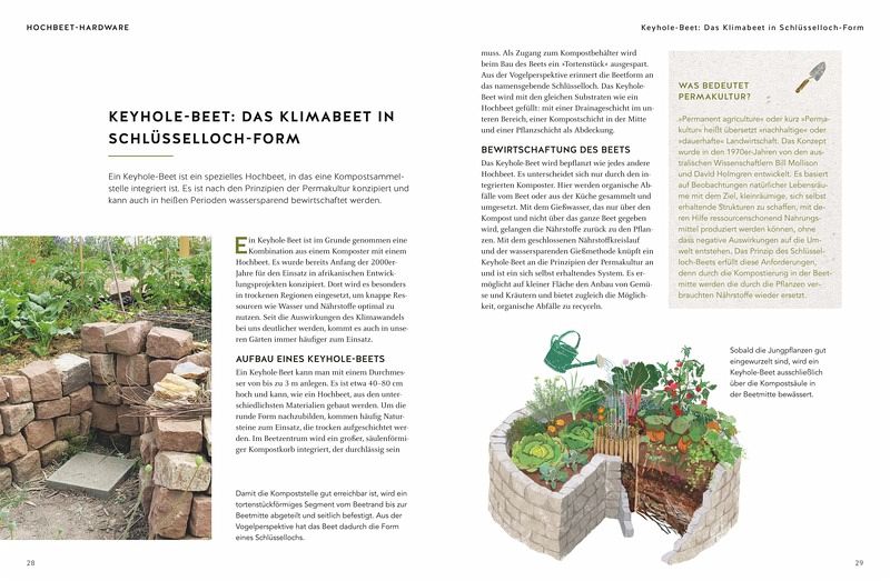 Dorothea Baumjohann zeigt in ihrem neuen Buch clevere Hochbeet-Ausstattungen, die z.B. die Wasserversorgung des Hochbeetes in besonders trockenen Sommern erleichtern und gibt zusätzlich Tipps zum Wassersparen, zur Substratverbesserung und Düngung im Hochbeet, sowie zur Bekämpfung von Schädlingen.
