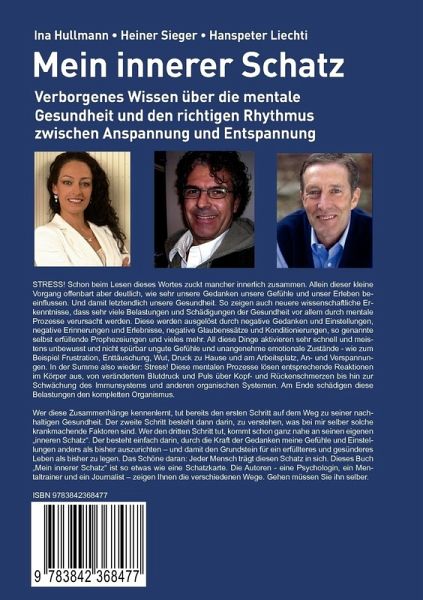 STRESS! Schon beim Lesen dieses Wortes zuckt mancher innerlich zusammen. Allein dieser kleine Vorgang offenbart aber deutlich, wie sehr unsere Gedanken unsere Gefühle und unser Erleben beeinflussen. Und damit letztendlich unsere Gesundheit. So zeigen auch neuere wissenschaftliche Erkenntnisse, dass sehr viele Belastungen und Schädigungen der Gesundheit vor allem durch mentale Prozesse verursacht werden. Diese werden ausgelöst durch negative Gedanken und Einstellungen, negative Erinnerungen und Erlebnisse, negative Glaubenssätze und Konditionierungen, so genannte selbst erfüllende Prophezeiungen und vieles mehr. All diese Dinge aktivieren sehr schnell und meistens unbewusst und nicht spürbar ungute Gefühle und unangenehme emotionale Zustände - wie zum Beispiel Frustration, Enttäuschung, Wut, Druck zu Hause und am Arbeitsplatz, An- und Verspannungen. In der Summe also wieder: Stress! Diese mentalen Prozesse lösen entsprechende Reaktionen im Körper aus, von verändertem Blutdruck undPuls über Kopf- und Rückenschmerzen bis hin zur Schwächung des Immunsystems und anderen organischen Systemen. Am Ende schädigen diese Belastungen den kompletten Organismus.Wer diese Zusammenhänge kennenlernt, tut bereits den ersten Schritt auf dem Weg zu seiner nachhaltigen Gesundheit. Der zweite Schritt besteht dann darin, zu verstehen, was bei mir selber solche krankmachende Faktoren sind. Wer den dritten Schritt tut, kommt schon ganz nahe an seinen eigenen "inneren Schatz". Der besteht einfach darin, durch die Kraft der Gedanken meine Gefühle und Einstellungen anders als bisher auszurichten - und damit den Grundstein für ein erfüllteres und gesünderes Leben als bisher zu legen. Das Schöne daran: Jeder Mensch trägt diesen Schatz in sich. Dieses Buch "Mein innerer Schatz" ist so etwas wie eine Schatzkarte. Die Autoren - eine Psychologin, ein Mentaltrainer und ein Journalist - zeigen Ihnen die verschiedenen Wege. Gehen müssen Sie ihn selber.
