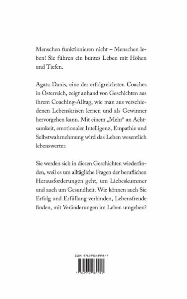 Agata Danis, eine der erfolgreichsten Coaches in Österreich, zeigt anhand von Geschichten aus ihrem Coaching-Alltag, wie man aus verschiedenen Lebenskrisen lernen und als Gewinner hervorgehen kann. Mit einem "Mehr" an Achtsamkeit, emotionaler Intelligenz, Empathie und Selbstwahrnehmung wird das Leben wesentlich lebenswerter.