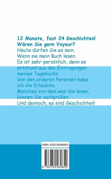 12 Monate, fast 24 Geschichten!Wären sie gern Voyeur?Heute sind sie es!Wenn sie mein Buch lesen.Es ist sehr persönlich,denn es entstand aus denEintragungen meines Tagebuchs.Manches von dem was sie lesenkönnen sie nachprüfen.Und dennoch, es sind Geschichten!
