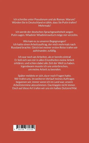 Ich schreibe unter Pseudonym und als Roman. Warum? Würden Sie in Deutschland erzähln, dass Sie Putin trafen? Mehrmals?Ich werde der deutschen Sprachgewohnheit wegen Putin sagen. Wladimir Wladimirowitsch möge mir verzeihn.Wie kam es zu unseren Begegnungen?Ich hatte einen Arbeitsauftrag, der mich mehrmals nach Russland brachte. Gleich bei meiner ersten Reise trafen wir aufeinander, zufällig.Ich war noch am Arbeiten, als er bereits eintraf.Er ließ sich von mir in allen Einzelheiten meine Arbeit erklären, und schien dabei alle Zeit der Welt zu haben.Irgendwann musste ich uns unterbrechen, um meine Arbeit zu beenden.Später meldete er sich, da er noch Fragen hatte.Wir trafen uns. Im weiteren Verlauf meines Auftrages begannen wir, immer wenn ich im Land war, unsere Arbeitstermine abzustimmen. Das klappte nicht immer.Doch auf diese Art trafen wir uns ein halbes Dutzend Mal.