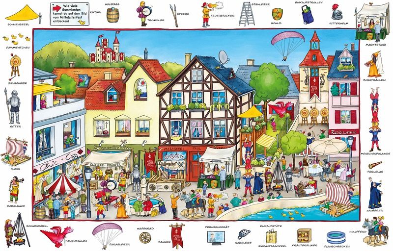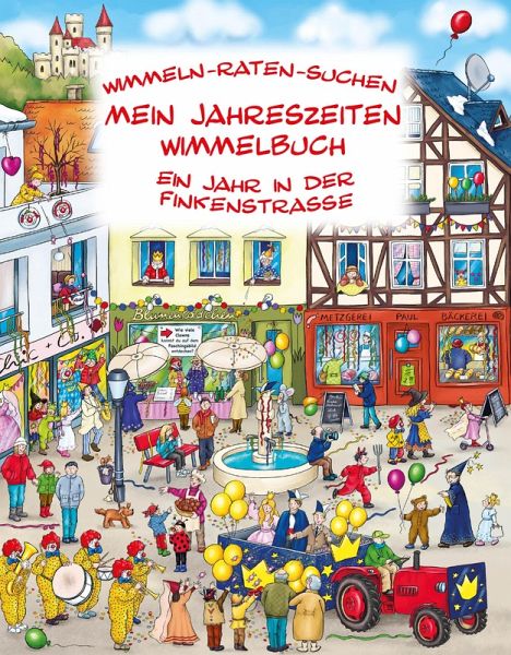 Mit diesem zauberhaften Wimmelbuch wird Kindern der Jahreslauf vermittelt.Unglaublich, was in der Finkenstraße alles passiert.Die bekannte Illustratorin Marlit Peikert aus Hessen führt mit einer Reihe großer, liebevoll und detailreich illustrierterSeiten und vielen Suchbildern durch das Buch und die verschiedenen Jahreszeiten.Ergänzend zu den Suchbildern gilt es pro Seite auch eine Rätselfrage zu lösen.Die Kleinen werden mit Feuereifer die "Rätselnuss" knacken wollen. Die Lösung gibt der auf der Rückseite abgedruckteQR-Code preis.Mal dir dein eigenes Wimmelbild: Die Malvorlage kann man über den QR-Code herunterladen.Durch die Suche nach den zahlreichen Bildern, die in den bunten Illustrationen versteckt sind, wird die Konzentrationsfähigkeit der Kinder trainiert.Das Benennen der Gegenstände unterstützt den Spracherwerb.Inhalt:Titel: Fasching1. Doppelseite: Ostern2. Doppelseite: Maibaum3. Doppelseite: Mittelalterfest4. Doppelseite: Sommer5. Doppelseite: Erntedank6. Doppelseite: Halloween7. Doppelseite: WeihnachtsmarktRückseite: Kirmes