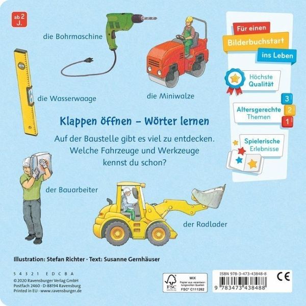 Der Bagger hebt die Baugrube aus. Der Ladekan bringt Ziegelsteine für die Hauswände. Und was macht ein Zimmermann?In diesem Buch lernen Kinder ab 2 Jahren viele Fahrzeuge, Handwerker und Werkzeuge kennen und benennen.Die viele Klappen ermöglichen es, die Baustelle aktiv zu entdecken: Was macht die Betonpumpe? Wann wird das Dach gedeckt? Und welche Werkzeuge braucht ein Installateur?Kurze Texte beschreiben kindgerecht die unterschiedlichen Schritte und Aufgaben beim Hausbau. Alle Werkzeuge, Fahrzeuge und Berufe werden genau benannt. Das regt kleine Baustellenfans zum Sprechen an und fördert den Aufbau des Wortschatzes. Ganz nebenbei fördern die Klappen auch die motorischen Fähigkeiten.Mit diesem Buch lernen große und kleine Entdecker die Welt der Baustelle kennen. Die Verbindung aus Wörterbuch und Klappen unterstützt dabei die sprachliche, kognitive und motorische Entwicklung von Babys und Kleinkindern.