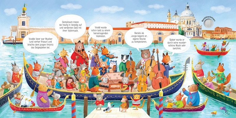 Das Tier-Orchester spielt fünf verschiedene Stücke von Antonio Vivaldi. Sein Gloria, das Mandolinenkonzert sowie drei der Vier Jahreszeiten begleiten dich, während du Spannendes über das Leben und Wirken dieses berühmten Komponisten erfährst. Mit einem integrierten Soundchip auf jeder Seite und praktischer Ein- und Ausschaltfunktion.