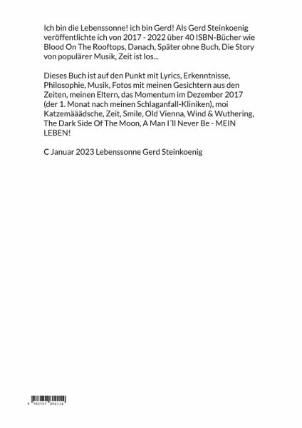 Ich bin die Lebenssonne! ich bin Gerd! Als Gerd Steinkoenig veröffentlichte ich von 2017 - 2022 über 40 ISBN-Bücher wie Blood On The Rooftops, Danach, Später ohne Buch, Die Story von populärer Musik, Zeit ist los...Dieses Buch ist auf den Punkt mit Lyrics, Erkenntnisse, Philosophie, Musik, Fotos mit meinen Gesichtern aus den Zeiten, meinen Eltern, das Momentum im Dezember 2017 (der 1. Monat nach meinen Schlaganfall-Kliniken), moi Katzemääädsche, Zeit, Smile, Old Vienna, Wind & Wuthering, The Dark Side Of The Moon, A Man I´ll Never Be - MEIN LEBEN!C Januar 2023 Lebenssonne Gerd Steinkoenig
