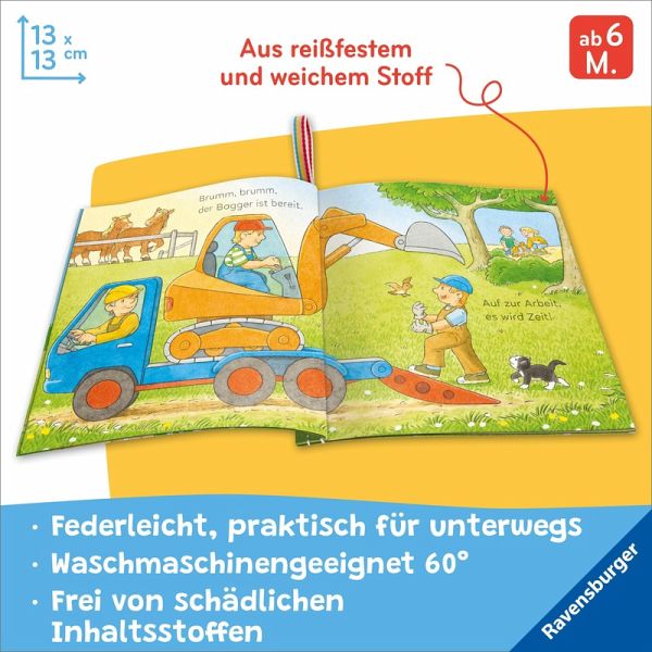 Auf der Baustelle ist was los! Begleite den Bagger bei seiner Arbeit. Ein kuschelstarkes Buch für jede Gelegenheit! Dieses federleichte Stoffbuch für Kinder ab 6 Monaten kommt mit ins Bett, in den Sandkasten, in die Badewanne und auch mal in die Waschmaschine. Unser buntes Knuddel-Knautsch-Buch lädt dazu ein, Bücher mit allen Sinnen zu entdecken - egal, ob mit Händen oder Zähnen.