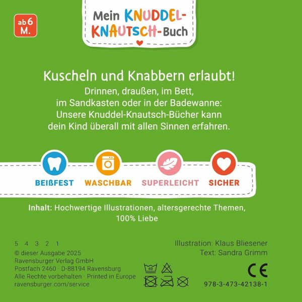 Mein Knuddel-Knautsch-Buch ist ein superstarkes Stoffbuch für jede Gelegenheit! Es ist besonders robust und lässt sich weder zerreißen noch zerbeißen. Trotzdem ist es kuschelweich und federleicht, sodass es auch für Kinder ab 6 Monaten bereits gut greifbar ist. Die bunten Bücher laden dazu ein, erste Geschichten mit allen Sinnen zu entdecken. Waschbar bei 60°C wird dieses Buch zu einem langlebigen Begleiter für kleine Leseratten.