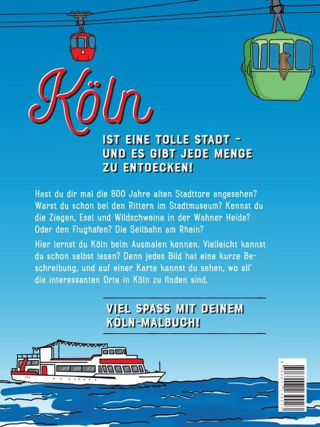 Köln ist eine tolle Stadt - und es gibt jede Menge zu entdecken!Hast du dir mal die 800 Jahre alten Stadttore angesehen? Warst du schon bei den Rittern im Stadtmuseum? Kennst du die Ziegen, Esel und Wildschweine in der Wahner Heide? Oder den Flughafen? Die Seilbahn am Rhein?Hier lernst du Köln beim Ausmalen besser kennen. Vielleicht kannst du schon selbst lesen? Denn jedes Bild hat eine kurze Beschreibung, und auf einer Karte kannst du sehen, wo all' die interessanten Orte in Köln zu finden sind.Viel Spaß mit deinem Köln-Malbuch!Spaß, Lerneffekt, Kreativität und Konzentration - dieses Malbuch ist die perfekte Verbindung!