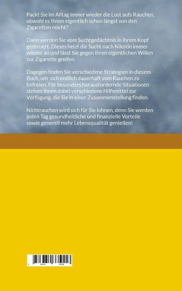 Kreisen Ihre Gedanken immer wieder um Zigaretten, obwohl Sie schon längst den Entschluss gefasst haben, Nichtraucher zu werden? Zünden Sie sich jedes Mal eine Neue an, auch wenn Sie genau wissen, dass es schädlich für Sie ist? Dann wird es höchste Zeit, sich vom Suchtgedächtnis in Ihrem Kopf zu befreien. Dieses heizt die Nikotinsucht immer wieder an und lässt Sie gegen Ihren eigentlichen Willen zur Zigarette greifen. Mit den Strategien in diesem Buch wird es Ihnen Schritt für Schritt gelingen, dieses Suchtgedächtnis auszuschalten und ein neues Selbstbewusstsein als Nichtraucher aufzubauen.Um ein neues, rauchfreies Leben beginnen zu können, brauchen Sie eine völlig neue Einstellung zum Rauchen.Lassen Sie die Vorstellung der Zigarette als kleines Helferlein in allen Situationen hinter sich. Ich zeige Ihnen in diesem Zusammenhang, wie die Tabakwerbung und das Nikotin Sie manipulieren und das Rauchen zu einer einzigen Illusion machen. Wie Sie sehen werden, ist das Rauchen nur ein falsches Spiel, das Ihnen einfach nichts Gutes bringt.Ich rate Ihnen in diesem Buch auf jeden Fall ab, von einer Sekunde auf die nächste mit dem Rauchen aufzuhören. Dieser sogenannte kalte Entzug ohne eine gezielte Vorbereitung birgt auf Dauer hohe Rückfallrisiken. Statt dem kalten Entzug lege ich Ihnen eine 5-tägige Vorbereitungszeit nahe, bei der Sie sich in Ruhe auf den Rauchstopp vorbereiten können. Im Mittelpunkt steht dabei die Selbstanalyse als Raucher. Diese wird Ihnen wichtige Informationen bringen, um in Zukunft erfolgreich rauchfrei zu bleiben.Ziel dieses Buches ist es, dass Sie möglichst bald Folgendes von sich behaupten können: Ich habe keinerlei Verlangen mehr nach einer Zigarette, ich genieße mein Leben als Nichtraucher!