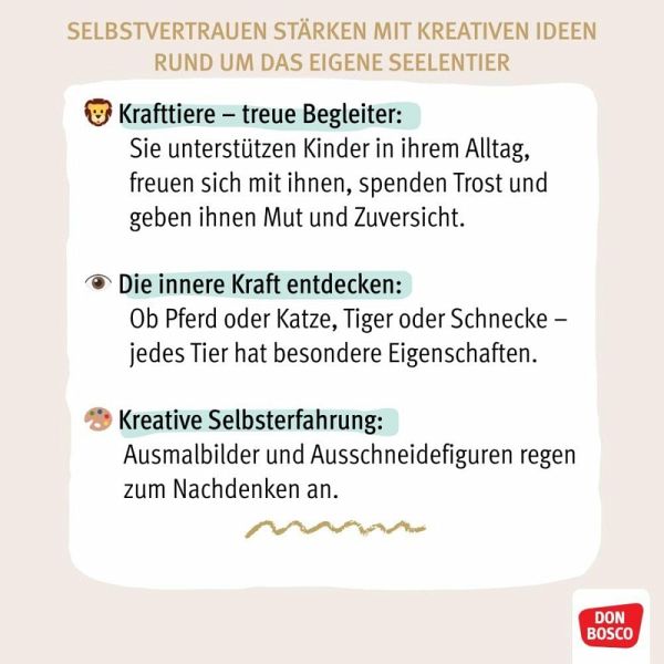 Bär, Vogel, Pferd oder Katze - jedes Krafttier hat besondere Eigenschaften, die es einzigartig machen. In der Auseinandersetzung mit ihnen lernen Kinder ihre eigenen Stärken besser kennen. Die vielfältigen Angebote in dem Mitmachheft reichen von Malvorlagen bis hin zu Reflexionsfragen, die bei der Selbstvergewisserung helfen.
