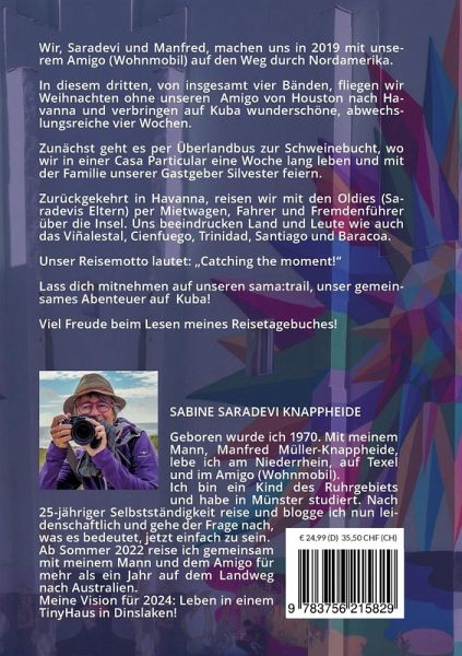 Wir, Saradevi und Manfred, machen uns in 2019 mit unserem Amigo (Wohnmobil) auf den Weg durch Nordamerika.In diesem dritten, von insgesamt fünf Bänden, fliegen wir Weihnachten ohne unseren Amigo von Houston nach Havanna und verbringen auf Kuba wunderschöne, abwechslungsreiche vier Wochen.Zunächst geht es per Überlandbus zur Schweinebucht, wo wir in einer Casa Particular eine Woche lang leben und Land mit der Familie unserer Gastgeber Silvester feiern. Zurückgekehrt in Havanna, reisen wir mit den Oldies (Saradevis Eltern) per Mietwagen, und Fahrer und Fremdenführer über die Insel. Uns beeindrucken Land und Leute wie auch das Viñalestal, Cienfuego, Trinidad, Santiago und Baracoa.Unser Reisemotto lautet: Catching the moment!Lass dich mitnehmen auf unseren sama:trail, unser gemeinsames Abenteuer auf Kuba!Viel Freude beim Lesen!