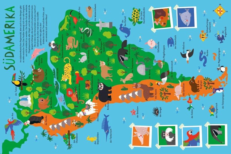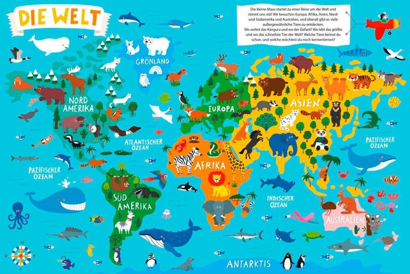 In diesem wimmeligen, bunten und großen Tieratlas für Kinder ab 3 Jahre gehen schon die Kleinsten auf weite Reise und entdecken ihre Lieblingstiere auf der ganzen Welt. Über 260 Tiere tummeln sich auf den kunterbunten Seiten. Jetzt heißt es Finger auf die Karte und los geht die Tier-Reise durch Europa, Afrika, Asien, Nordamerika, Südamerika und Australien.