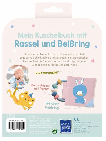Weiches Stoffbuch mit Beißring und einer Rassel mit Perlien. Mit diesem weichen Kuschelbuch können Babys stundenlang spielen und verschiedene Facetten erkunden. Die farbenfrohen Illustrationen fesseln den Blick. Die Rassel mit bunten Perlen und knisternde Seiten fördern das Gehör und stimulieren die Entwicklung der kindlichen Sinne. Durch den Beißring wird das Buch zum idealen Begleiter, wenn die ersten Zähne kommen.