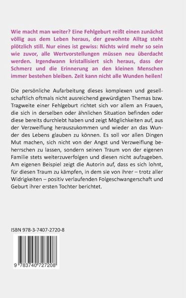 Wie macht man weiter? Eine Fehlgeburt reißt einen zunächst völlig aus dem Leben heraus, der gewohnte Alltag steht plötzlich still. Nur eines ist gewiss: Nichts wird mehr so sein wie zuvor, alle Wertvorstellungen müssen neu überdacht werden. Irgendwann kristallisiert sich heraus, dass der Schmerz und die Erinnerung an den kleinen Menschen immer bestehen bleiben. Zeit kann nicht alle Wunden heilen!Die persönliche Aufarbeitung dieses komplexen und gesellschaftlich oftmals nicht ausreichend gewürdigten Themas bzw. Tragweite einer Fehlgeburt richtet sich vor allem an Frauen, die sich in derselben oder ähnlichen Situation befinden oder diese bereits durchlebt haben und zeigt Möglichkeiten auf, aus der Verzweiflung herauszukommen und wieder an das Wunder des Lebens glauben zu können. Es soll vor allen Dingen Mut machen, sich nicht von der Angst und Verzweiflung beherrschen zu lassen, sondern seinen Traum von der eigenen Familie stets weiterzuverfolgen und diesen nicht aufzugeben. Am eigenen Beispiel zeigt die Autorin auf, dass es sich lohnt, für diesen Traum zu kämpfen, in dem sie von ihrer - trotz aller Widrigkeiten - positiv verlaufenden Folgeschwangerschaft und Geburt ihrer ersten Tochter berichtet.