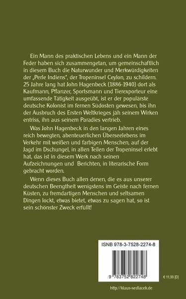 Ein Mann des praktischen Lebens und ein Mann der Feder haben sich zusammengetan, um gemeinschaftlich in diesem Buch die Naturwunder und Merkwürdigkeiten der "Perle Indiens", der Tropeninsel Ceylon, zu schildern. 25 Jahre lang hat John Hagenbeck (1886-1940) dort als Kaufmann, Pflanzer, Sportsmann und Tierexporteur eine umfassende Tätigkeit ausgeübt, ist er der populärste deutsche Kolonist im fernen Südosten gewesen, bis ihn der Ausbruch des Ersten Weltkrieges jäh seinem Wirken entriss, ihn aus seinem Paradies vertrieb. Was John Hagenbeck in den langen Jahren eines reich bewegten, abenteuerlichen Überseelebens im Verkehr mit weißen und farbigen Menschen, auf der Jagd im Dschungel in allen Teilen der Tropeninsel erlebt hat, das ist in diesem Werk nach seinen Aufzeichnungen und Berichten, in literarische Form gebracht worden. Wenn dieses Buch allen denen, die es aus unserer deutschen Beengtheit wenigstens im Geiste nach fernen Küsten, zu fremdartigen Menschen und seltsamen Dingen lockt, etwas bietet, etwas zu sagen hat, so ist sein schönster Zweck erfüllt!