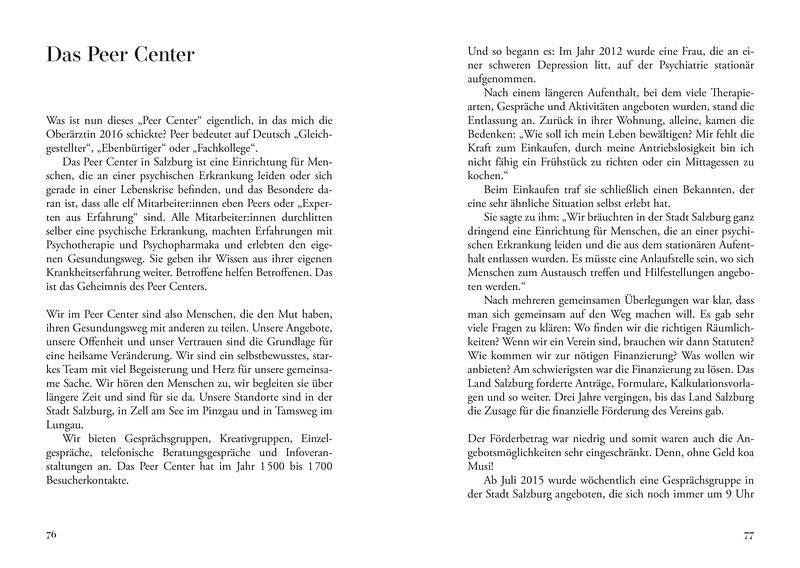 Nach mehreren stationären Aufenthalten, zahlreichen Gesprächen mit Ärzt:innen und dem Versuch unterschiedlicher Therapie-Ansätze verbesserte sich ihr Zustand langsam. 2016, als sie wieder gesund war, begann sie im Salzburger Peer Center zu arbeiten und engagiert sich dort seither, damit Betroffene anderen Betroffenen helfen können.
