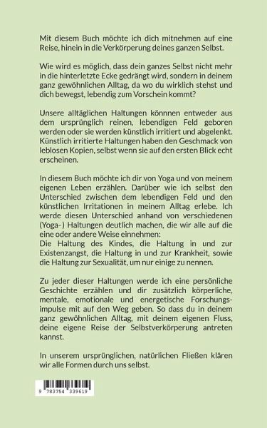 Mit diesem Buch möchte ich dich mitnehmen auf eine Reise, hinein in die Verkörperung deines ganzen Selbst.Wie wird es möglich, dass dein ganzes Selbst nicht mehr in die hinterletzte Ecke gedrängt wird, sondern in deinem ganz gewöhnlichen Alltag, da wo du wirklich stehst und dich bewegst, lebendig zum Vorschein kommt? Unsere alltäglichen Haltungen könnnen entweder aus dem ursprünglich reinen, lebendigen Feld geboren werden oder sie werden künstlich irritiert und abgelenkt. Künstlich irritierte Haltungen haben den Geschmack von leblosen Kopien, selbst wenn sie auf den ersten Blick echt erscheinen. In diesem Buch möchte ich dir von Yoga und von meinem eigenen Leben erzählen. Darüber wie ich selbst den Unterschied zwischen dem lebendigen Feld und den künstlichen Irritationen in meinem Alltag erlebe. Ich werde diesen Unterschied anhand von verschiedenen (Yoga-) Haltungen deutlich machen, die wir alle auf die ein oder andere Weise einnehmen:Die Haltung des Kindes, die Haltung in und zur Existenzangst, die Haltung in und zur Krankheit, sowie die Haltung zur Sexualität, um nur einige zu nennen. Zu jeder dieser Haltungen werde ich eine persönliche Geschichte erzählen und dir zusätzlich körperliche, mentale, emotionale und energetische Forschungsimpulse mit auf den Weg geben. So dass du in deinem ganz gewöhnlichen Alltag, mit deinem eigenen Fluss, deine eigene Reise der Selbstverkörperung antreten kannst.In unserem ursprünglichen, natürlichen Fließen klären wir alle Formen durch uns selbst.