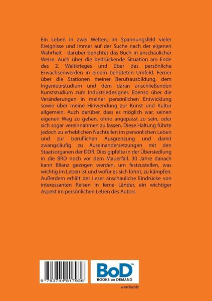Ein Leben in zwei Welten, im Spannungsfeld vieler Ereignisse und immer auf der Suche nach der eigenen Wahrheit - darüber berichtet das Buch in anschaulicher Weise. Auch über die bedrückende Situation am Ende des 2. Weltkrieges und über das persönliche Erwachsenwerden in einem behüteten Umfeld. Ferner über die Stationen meiner Berufsausbildung, dem Ingenieurstudium und dem daran anschließenden Kunststudium zum Industriedesigner. Ebenso über die Veränderungen in meiner persönlichen Entwicklung sowie über meine Hinwendung zur Kunst und Kultur allgemein. Auch darüber, dass es möglich war, seinen eigenen Weg zu gehen, ohne angepasst zu sein, oder sich sogar vereinnahmen zu lassen. Diese Haltung führte jedoch zu erheblichen Nachteilen im persönlichen Leben und zur beruflichen Ausgrenzung und damit zwangsläufig zu Auseinandersetzungen mit den Staatsorganen der DDR. Dies gipfelte in der Übersiedlung in die BRD noch vor dem Mauerfall. 30 Jahre danach kann Bilanz gezogen werden, um festzustellen, was wichtig im Leben ist und wofür es sich lohnt, zu kämpfen. Außerdem erhält der Leser anschauliche Eindrücke von interessanten Reisen in ferne Länder, ein wichtiger Aspekt im persönlichen Leben des Autors.